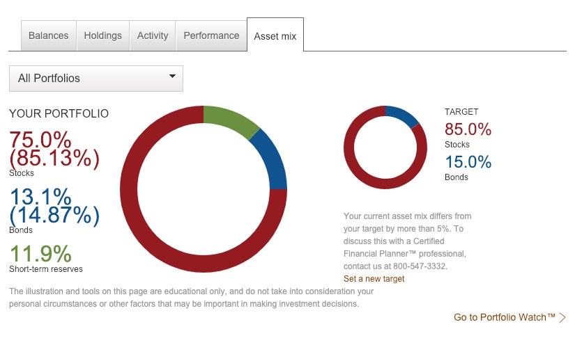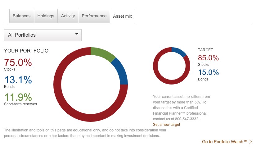 Vanguard's website has a great "Asset mix" tab on the first screen shown after logging in. This tab shows my portfolio allocation percentages of stocks, bonds, and "short-term reserves" (basically, cash).