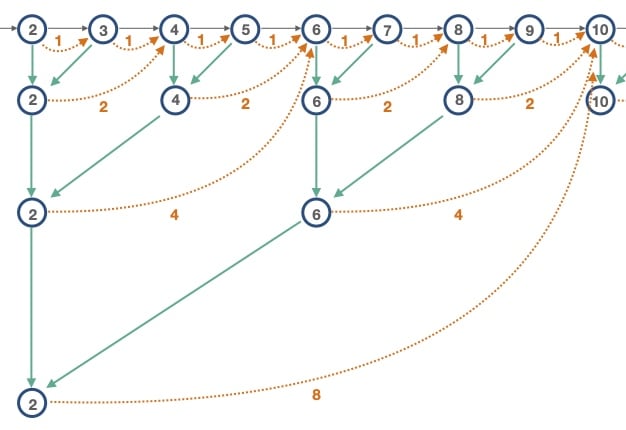 In the diagram above, each circle represents a Mandelbrot set iteration. The gray arrows represent regular perturbation theory iterations to move sequentially from one iteration to the next. The orange dotted arrows represent iterations that can be skipped by applying a BLA. For the "Level 1" BLAs, we "skip" only a single iteration. Adjacent pairs of "Level 1" BLAs are merged to create 2-iteration "Level 2" BLAs. We merge all the way to the largest BLA, at "Level 4" which can skip 8 iterations.
