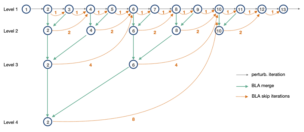At iteration 2, we first test the "Level 1" BLA. If valid, we then test the "Level 4" BLA. Say that's valid, and we can apply that BLA to end up at iteration 10.