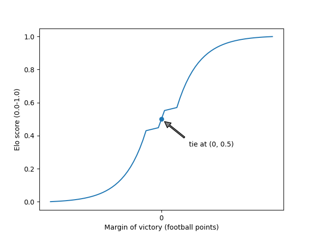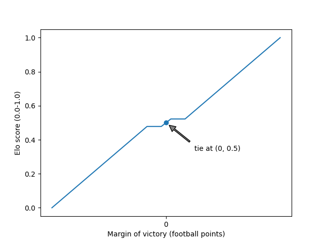 And here we have the new curved mapping (exaggerated a little to make it easier to see). We still have the 0.5 Elo score in the middle of the plot for a tie. To the right of that, we now have a short linear section where narrow margins of victory are now awarded a higher Elo score. Continuing right, over larger margins of victory, we now have a significant curve that initially awards larger, but sub-"blowout," margins of victory a higher Elo score than the previous linear mapping. As we approach the right edge of the plot we enter "blowout" territory where the curve flattens out so as not to over-reward bigger and bigger blowouts.