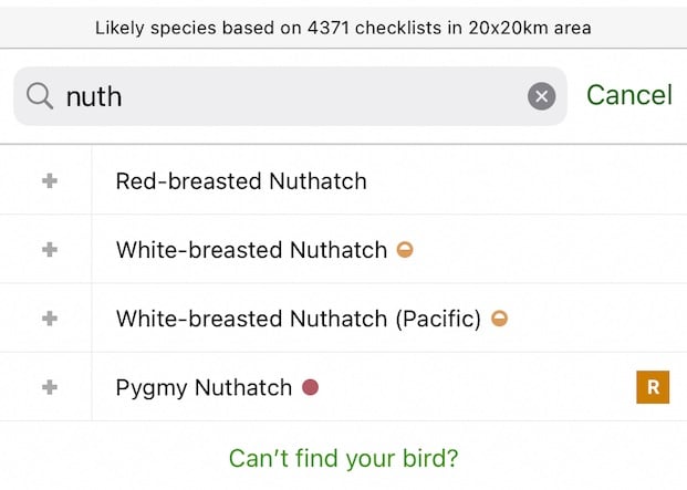 This is looking good. I can find nuthatches just by typing nuth as expected. But this is how eBird's app already works: