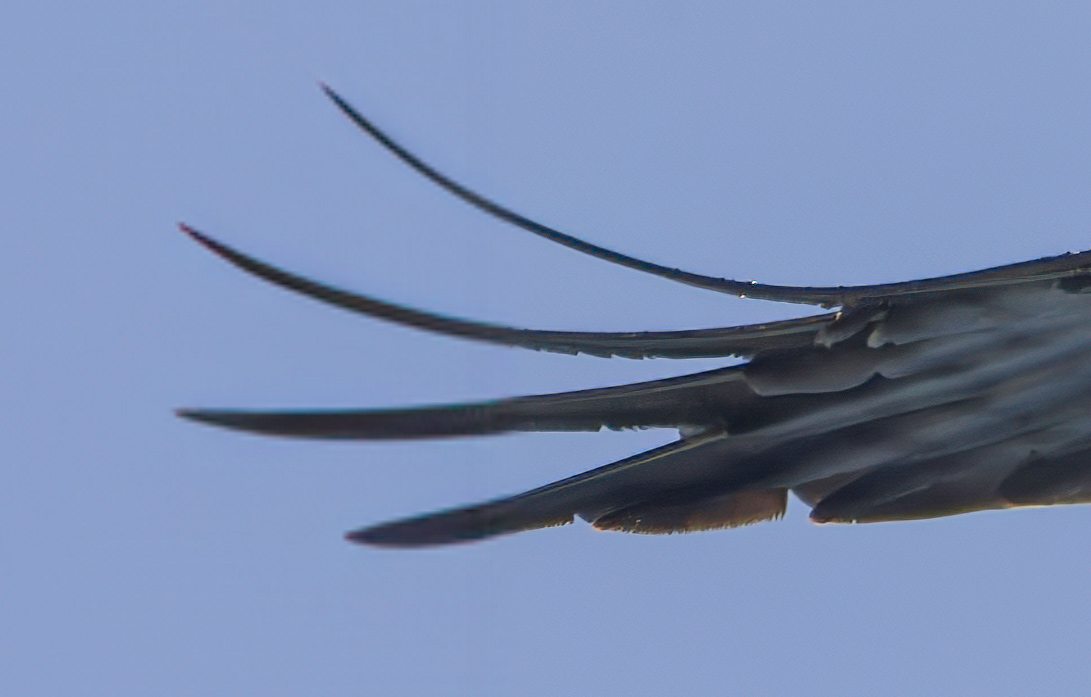 The results look great when shrunk down to 15% size here. The length and positioning of the feathers looks nice, and the added sky background blends in fine. At 100% scale though, it doesn't look so perfect. The first problem I noticed was that the drawn-in feather tips appear out-of-focus. The rest of the wings are fairly sharp so I'm not sure why Photoshop drew them in this way: