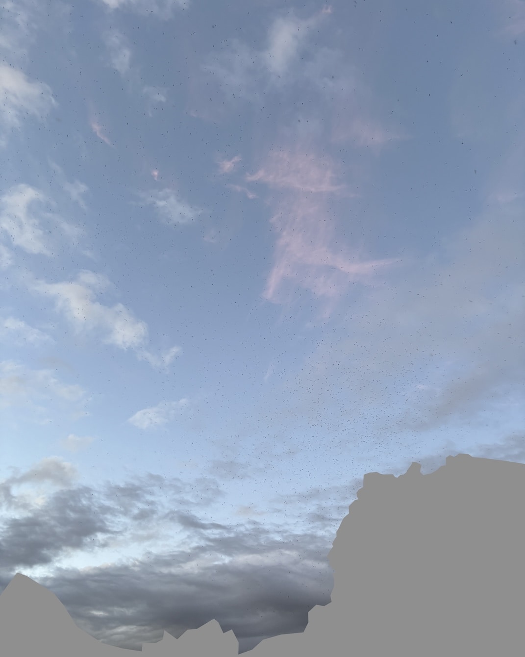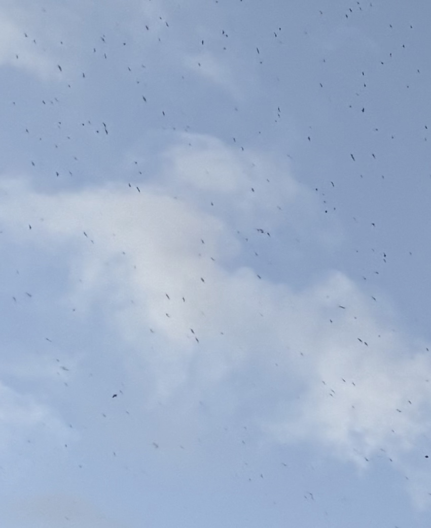 Thanks to the OpenCV script I have a very good count for the number of birds in the photo. As for estimating the total number of swifts that were gathered there, I figured I may have been lucky to get a bit more than half of all the birds in the photo since I specifically took a very wide shot where a large relatively dense cloud of the birds had formed.