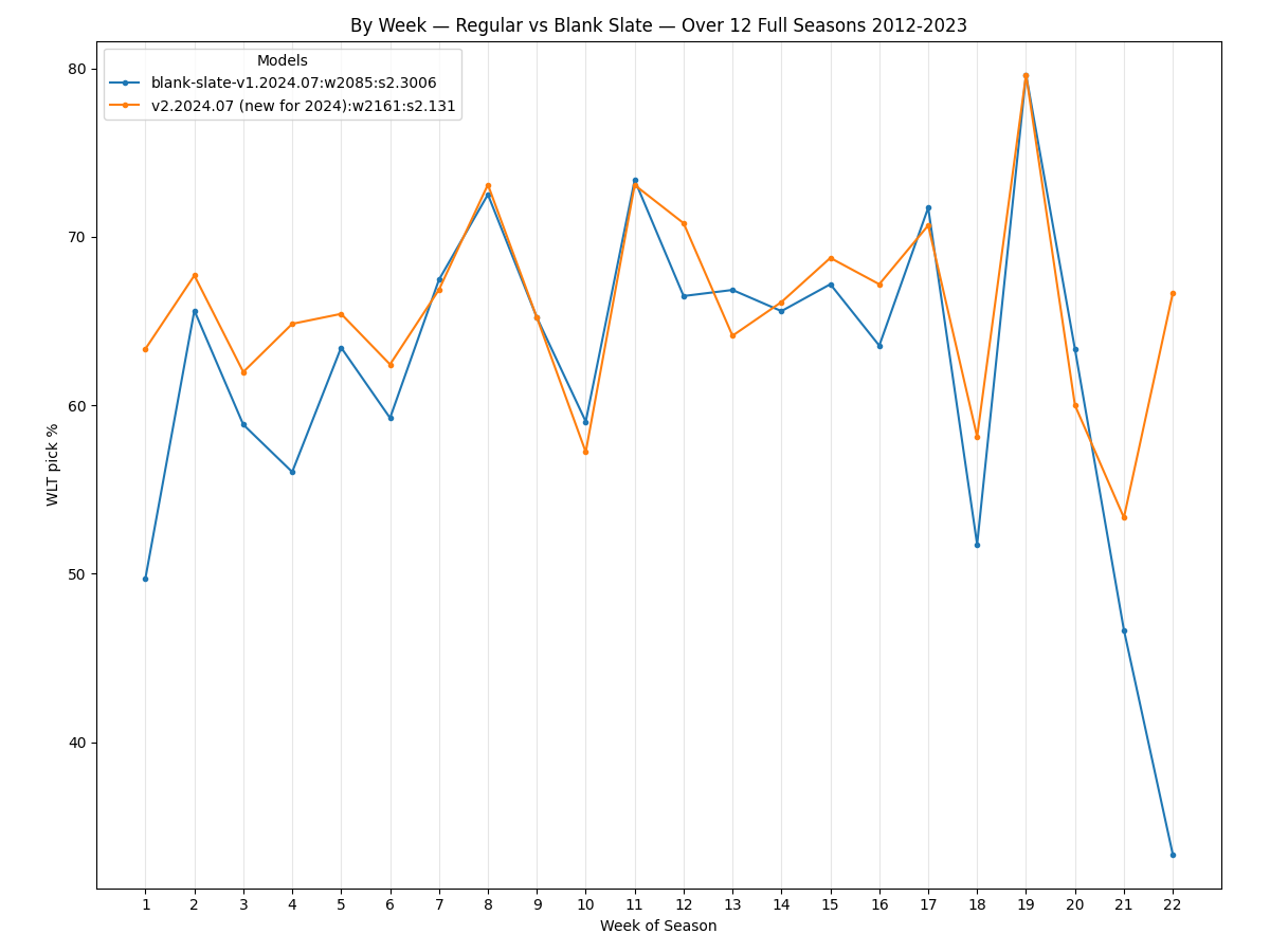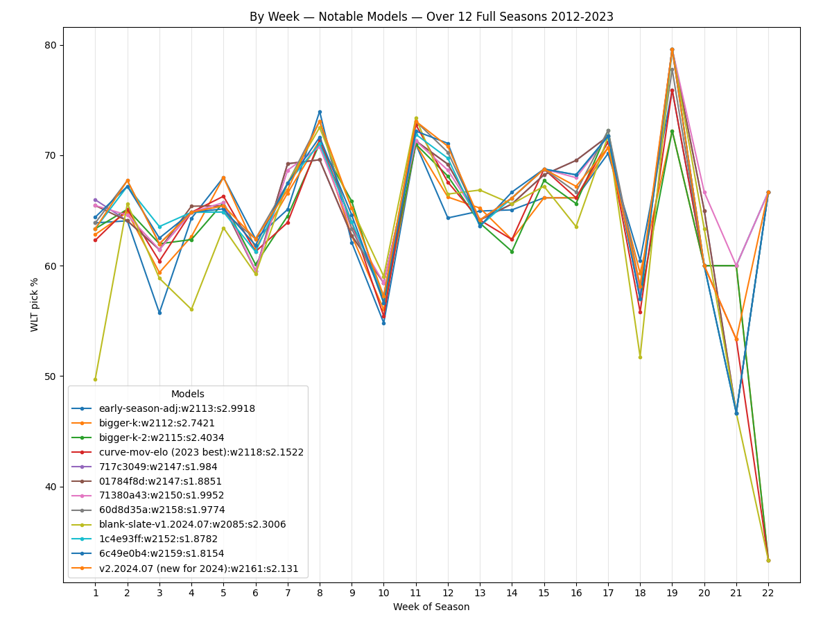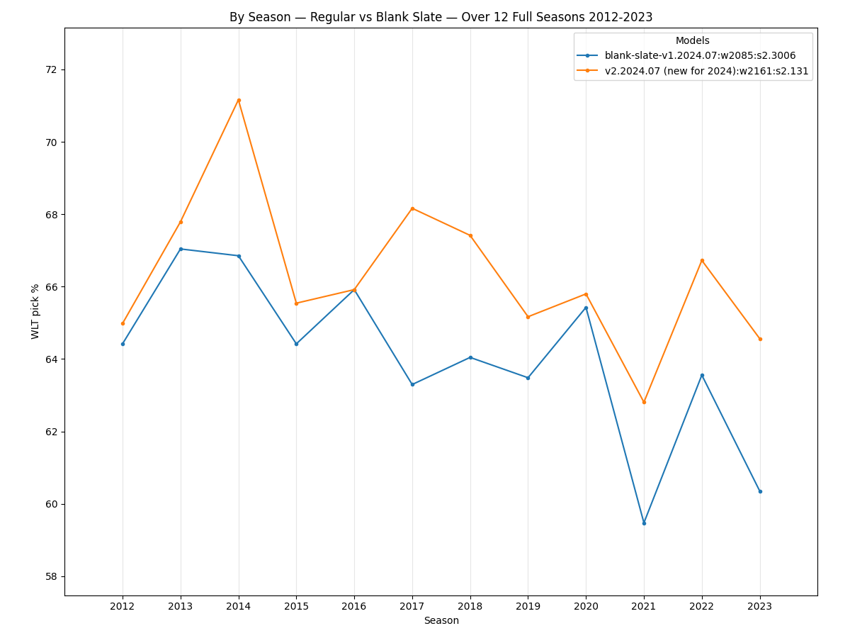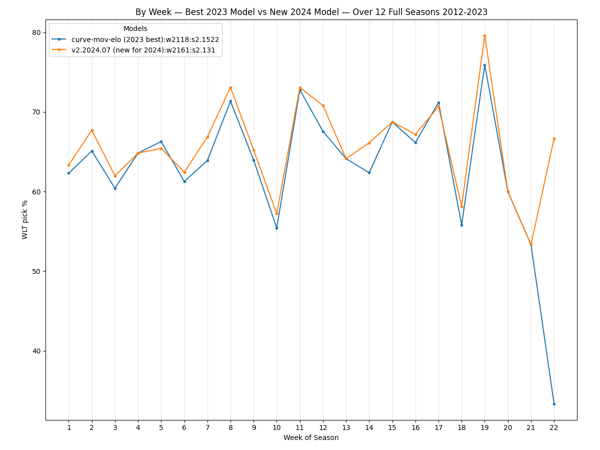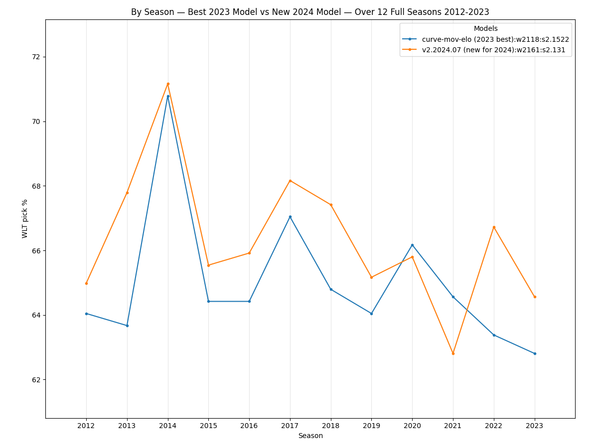 The best Elo model used during the 2023 season correctly picks 2,118 out of 3,259 game winners (65.0%) over the 12 seasons from 2012-2023. The new v2.2024.07 model picks 2,161 of 3,259 game winners (66.3%) over that span, which averages a net of 3.58 more correctly-picked games per season.