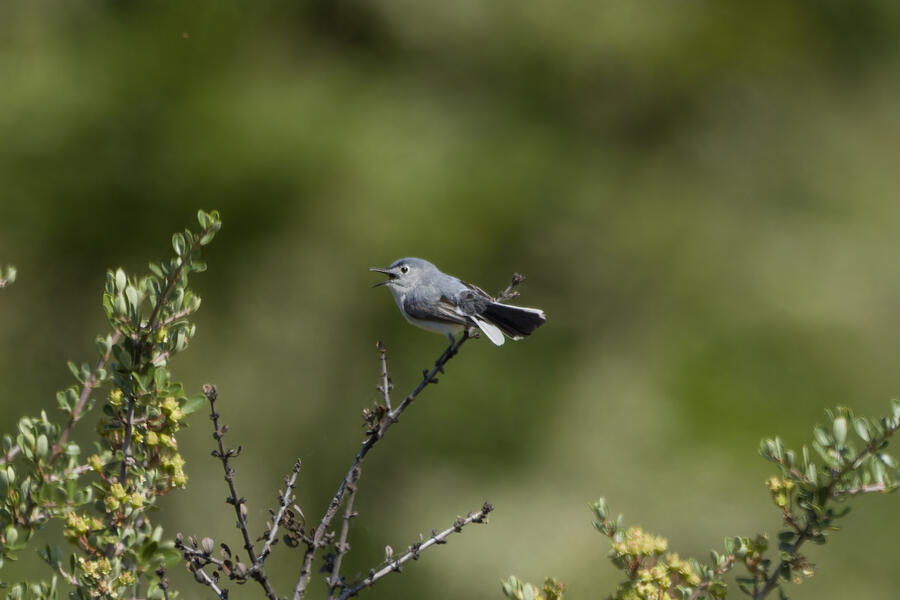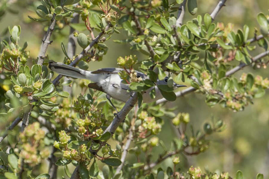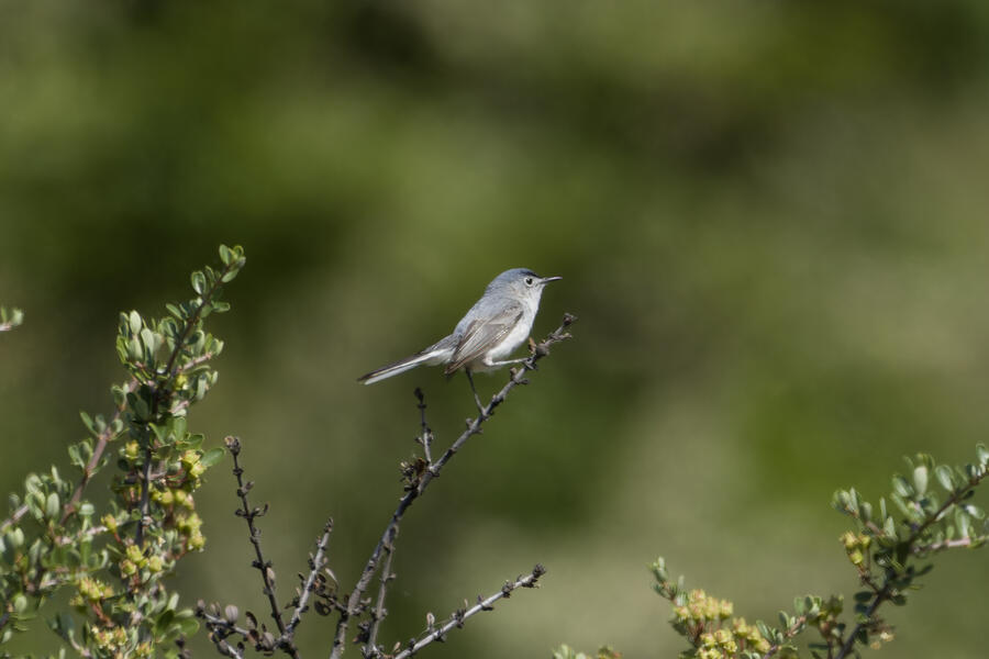 I waited at the location for a few minutes before hearing, barely, a soft Gnatcatcher song or call. A few minutes later a male started singing and flying around from perch to perch. He was easier to spot. I only got around three minutes where I was able to see him and take photos. He was about the size and shape of a Bewick's Wren, but had coloring more like a White-breasted Nuthatch. A very cool bird! I'll have to try to find these birds again next year, a few weeks earlier in the spring, when they're out in the open singing more often.