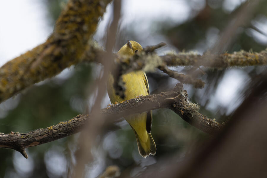 Yellow WarblerThis bird is yellow and without many other field marks. That I think indicates Yellow Warbler. I looked at photos of Orange-crowned Warbler as well, but those don't have the yellow color extending all the way to the tip of the under tail like this bird does, and the bill doesn't quite look pointy enough. I am pretty confident this is a Yellow Warbler.