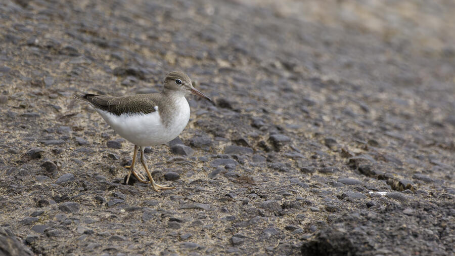 Spotted SandpiperI've photographed a Spotted Sandpiper at this exact location before. I was out of position this time, and I couldn't move or else I'd scare it off. It was moving along the water's edge, toward me, so I crouched down and waited: there was a small gap between some bushes where it would be visible unobstructed, so I had to be ready to hit the shutter at the right instant. It was moving pretty quickly as it scampered along. I was able to focus and fire off only three exposures while it was between the bushes. Luckily this exposure was in focus, and with good eye contact!
