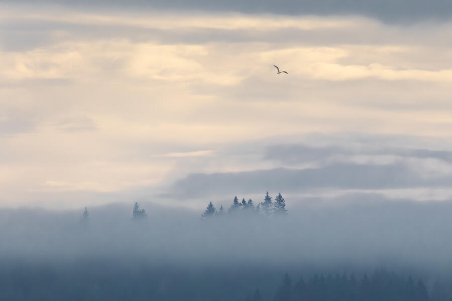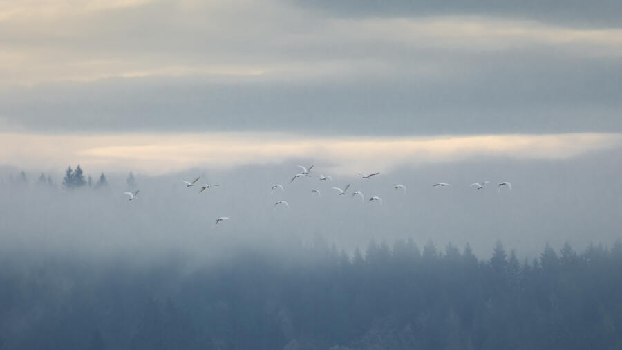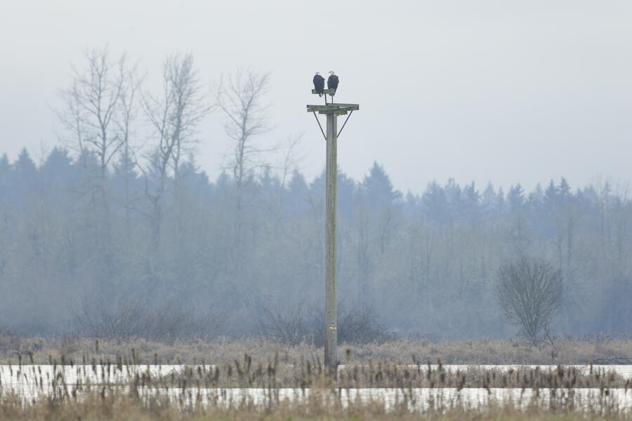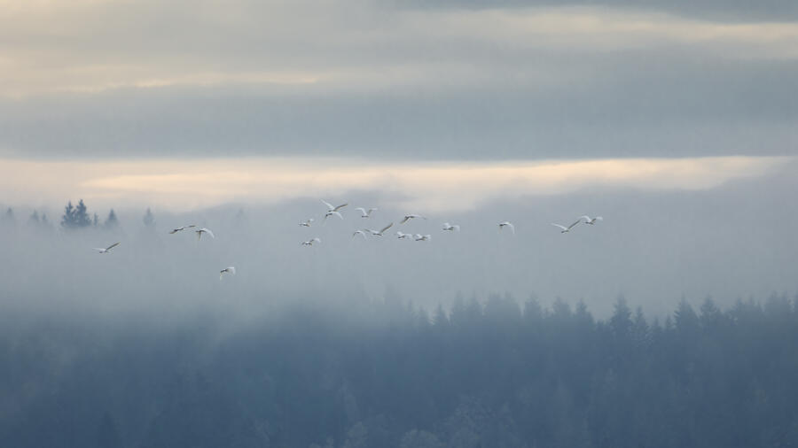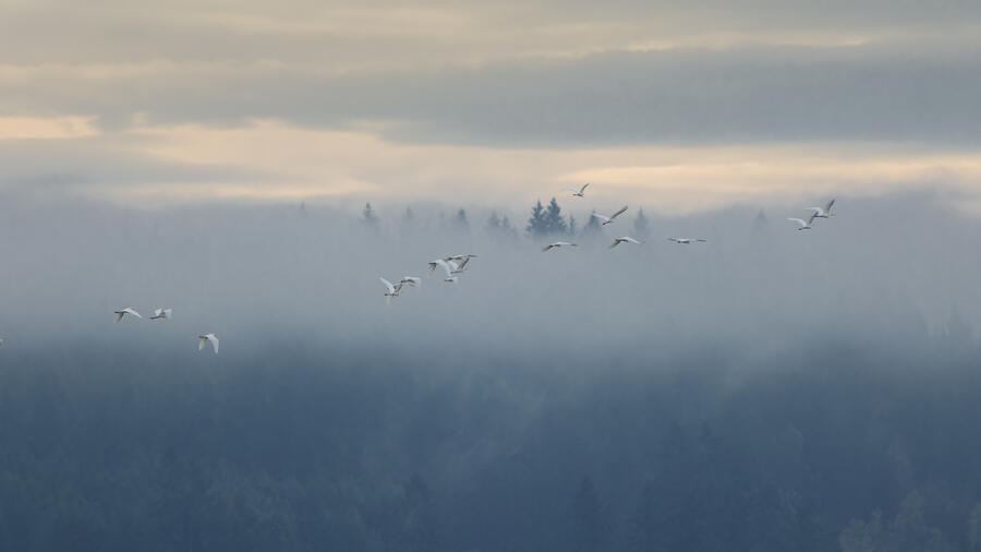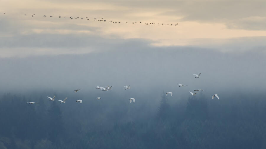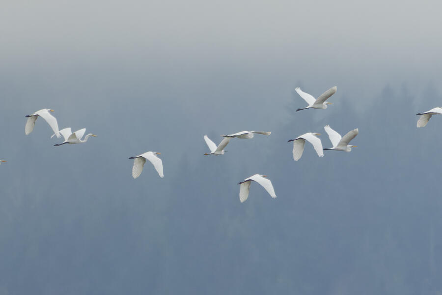 I made a quick trip out to the wetlands. There was some nice light and mist, and I was able to get some landscape shots and panoramas. I was lucky enough to spot a group of large white birds take off in the distance, and get my camera ready fast enough to capture them with a nice backdrop. They turned out to be Great Egrets with a Snowy Egret among them! Based on recent sightings in the area I'm pretty sure it's the same individual Snowy Egret I saw here in December.