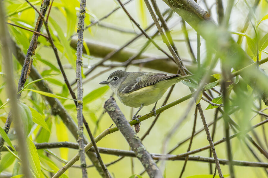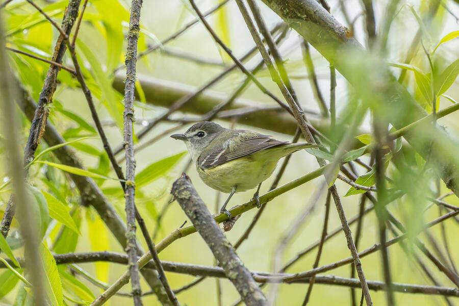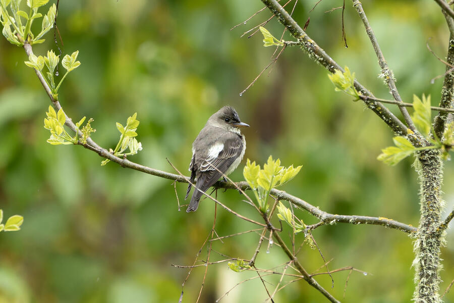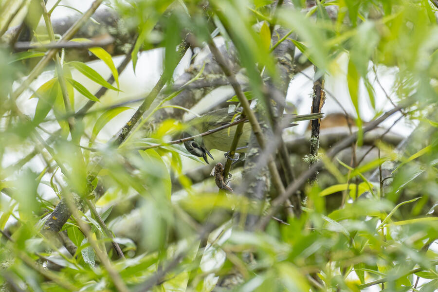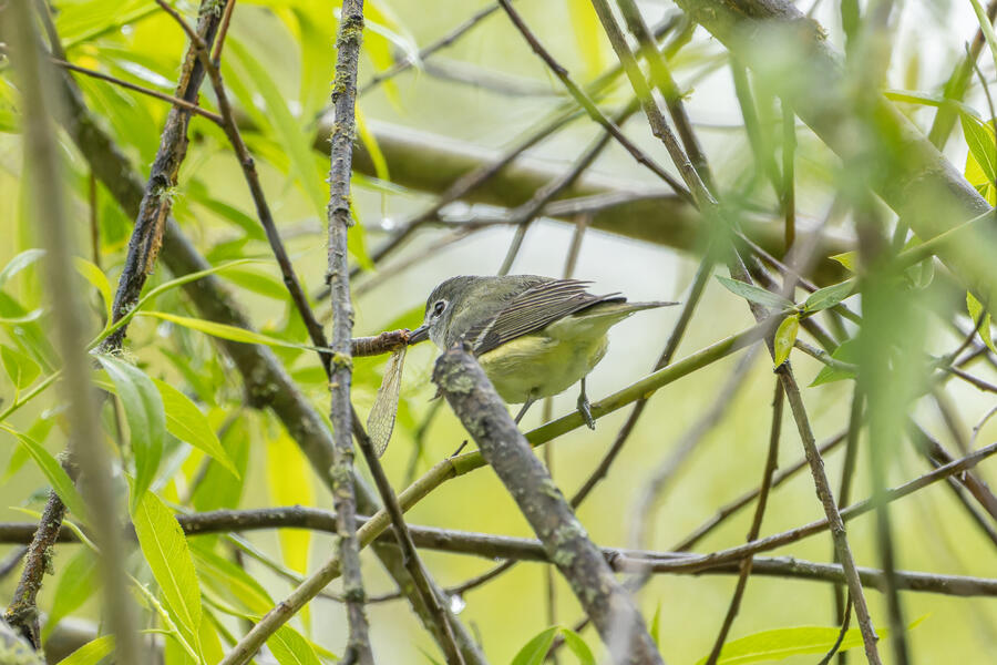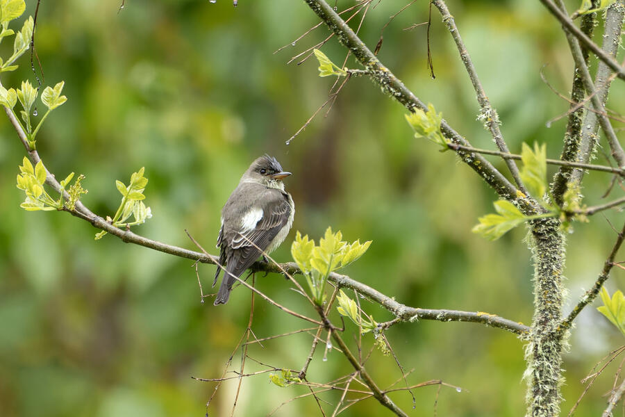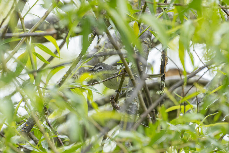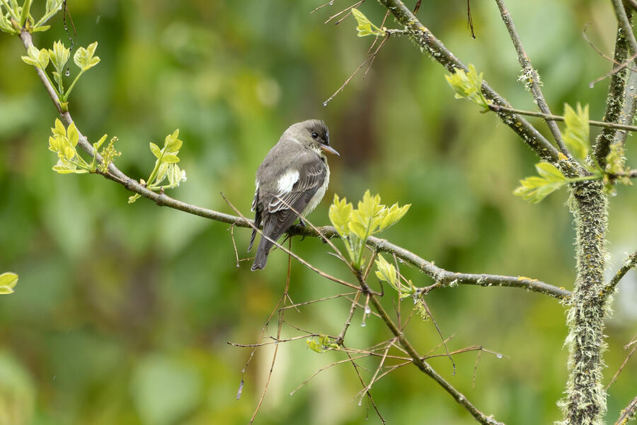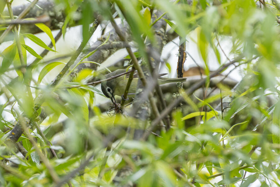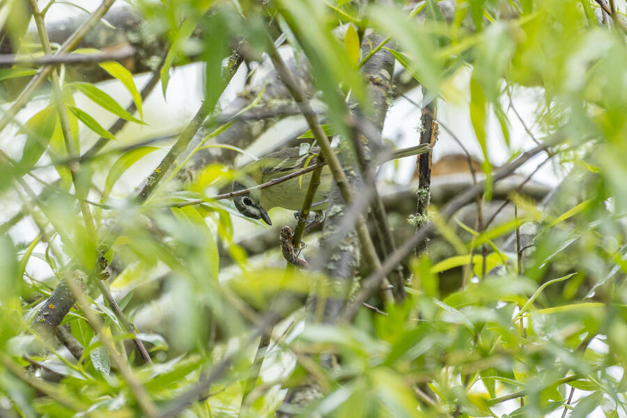 On a rainy morning here in the middle of migration season I went down to the river to try to find an owl nesting in a tree cavity. I didn't have any luck with the owl, but I'm planning to return to try again. What I did see was a dark and mysterious flycatcher with a heavy bill and very obvious white tufts sticking out from each wing. I should have been able to ID it from the white tufts alone, but for some reason that detail didn't immediately click for me. I only saw the back of the bird — had I seen its belly I would have ID'd it right away (foreshadowing the next day's bird). I also took lots of photos of a Cassin's Vireo eating a rather large winged insect. It carried its meal down into a low shrub right at eye level. This was a much longer and better look at a Cassin's Vireo than I'd ever had before, so that was great.