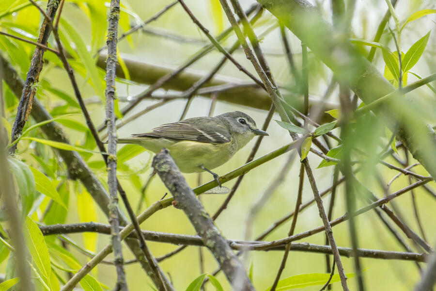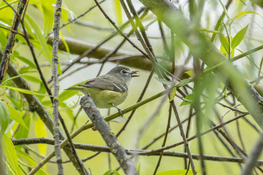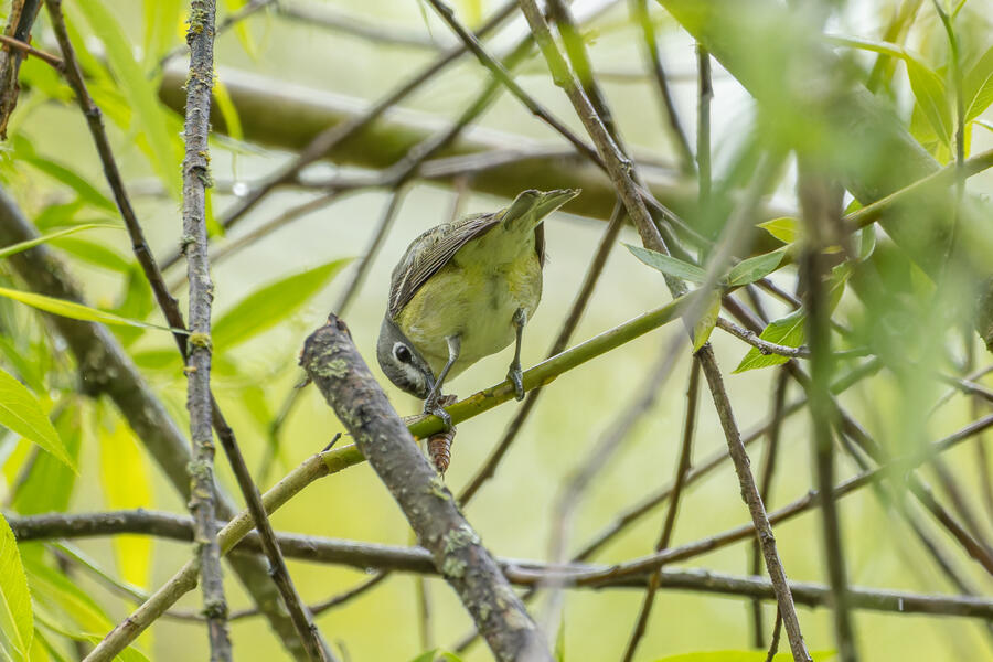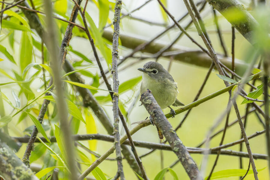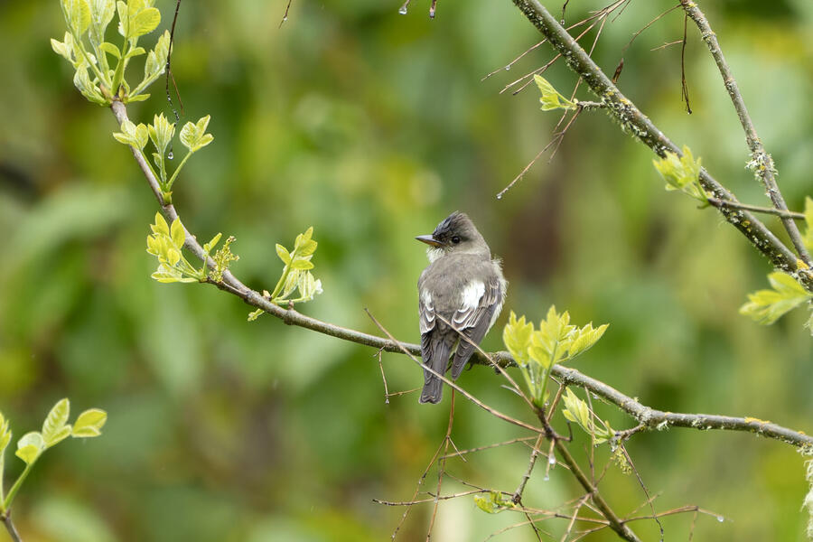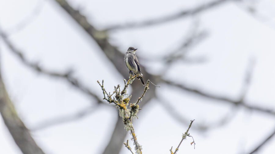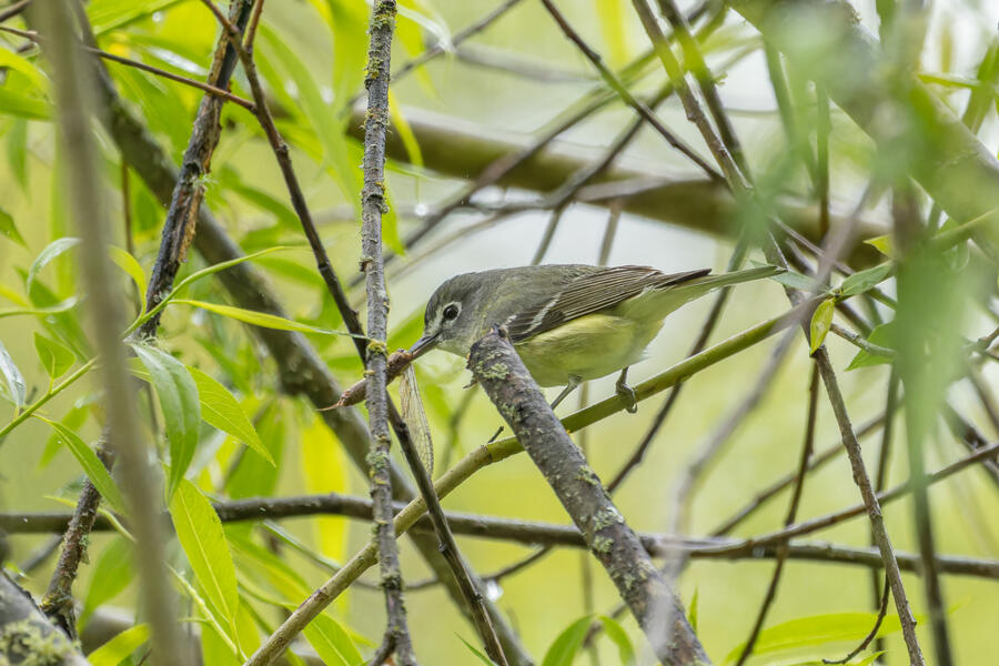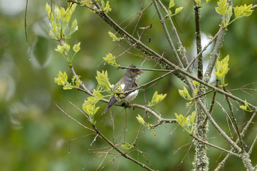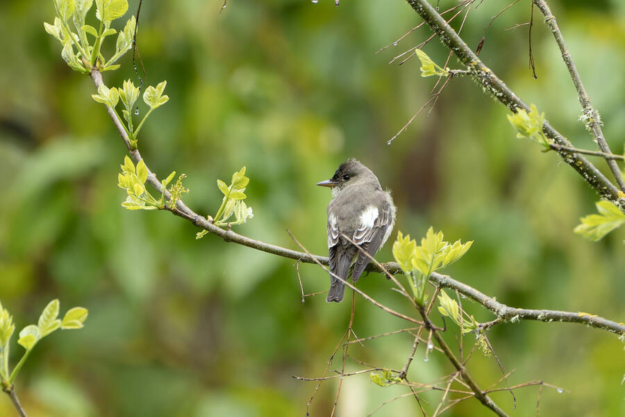 On a rainy morning here in the middle of migration season I went down to the river to try to find an owl nesting in a tree cavity. I didn't have any luck with the owl, but I'm planning to return to try again. What I did see was a dark and mysterious flycatcher with a heavy bill and very obvious white tufts sticking out from each wing. I should have been able to ID it from the white tufts alone, but for some reason that detail didn't immediately click for me. I only saw the back of the bird — had I seen its belly I would have ID'd it right away (foreshadowing the next day's bird). I also took lots of photos of a Cassin's Vireo eating a rather large winged insect. It carried its meal down into a low shrub right at eye level. This was a much longer and better look at a Cassin's Vireo than I'd ever had before, so that was great.