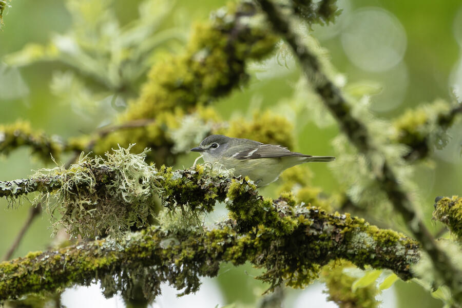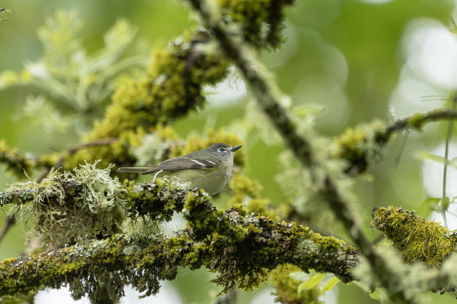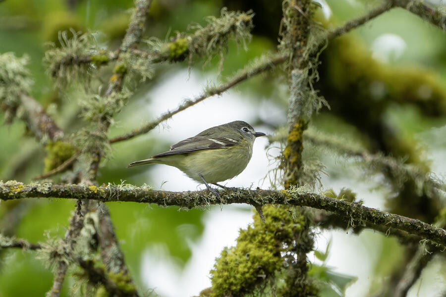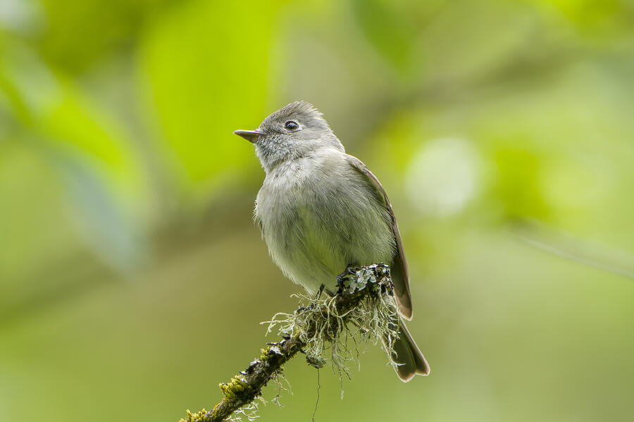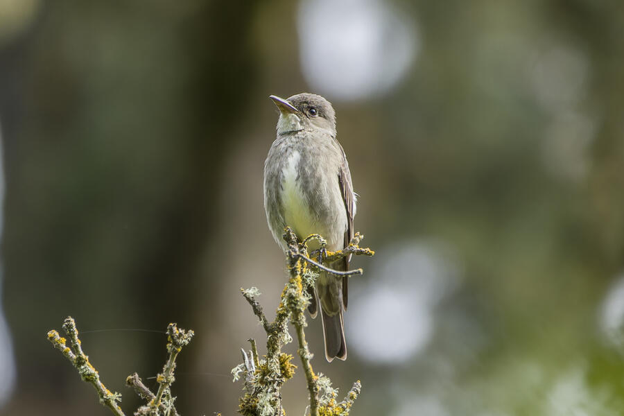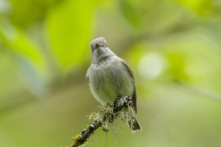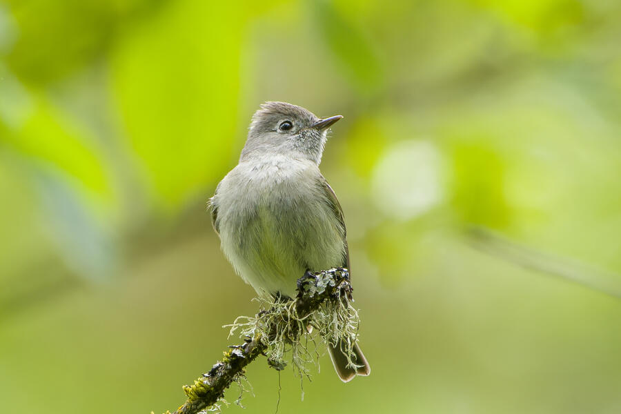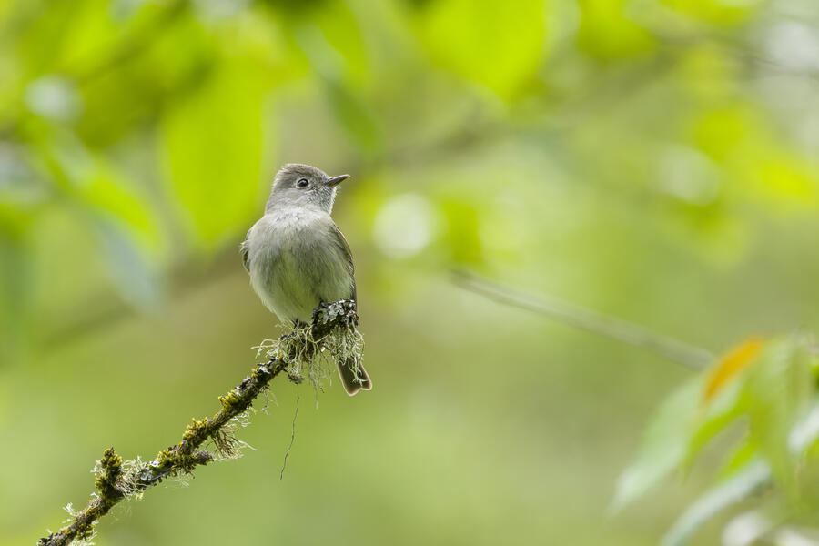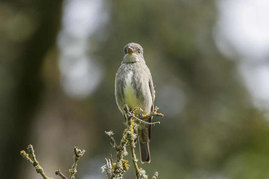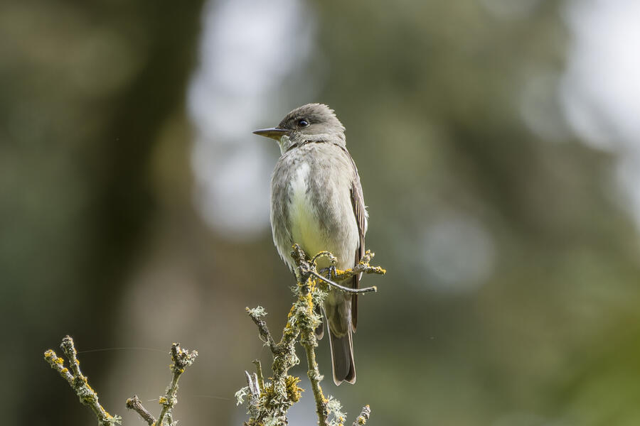 On a rainy morning here in the middle of migration season I went down to the river to try to find an owl nesting in a tree cavity. I didn't have any luck with the owl, but I'm planning to return to try again. What I did see was a dark and mysterious flycatcher with a heavy bill and very obvious white tufts sticking out from each wing. I should have been able to ID it from the white tufts alone, but for some reason that detail didn't immediately click for me. I only saw the back of the bird — had I seen its belly I would have ID'd it right away (foreshadowing the next day's bird). I also took lots of photos of a Cassin's Vireo eating a rather large winged insect. It carried its meal down into a low shrub right at eye level. This was a much longer and better look at a Cassin's Vireo than I'd ever had before, so that was great.