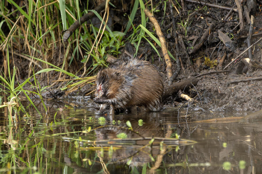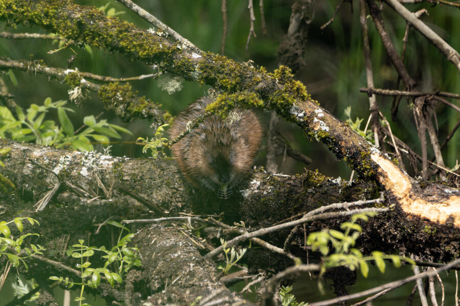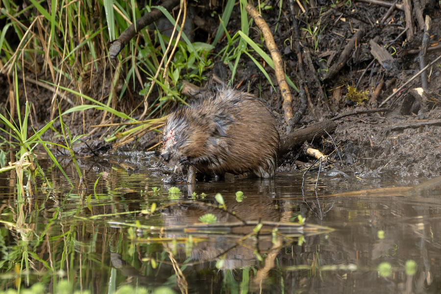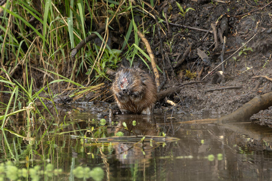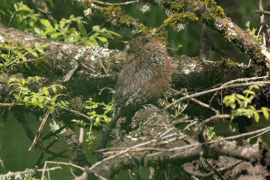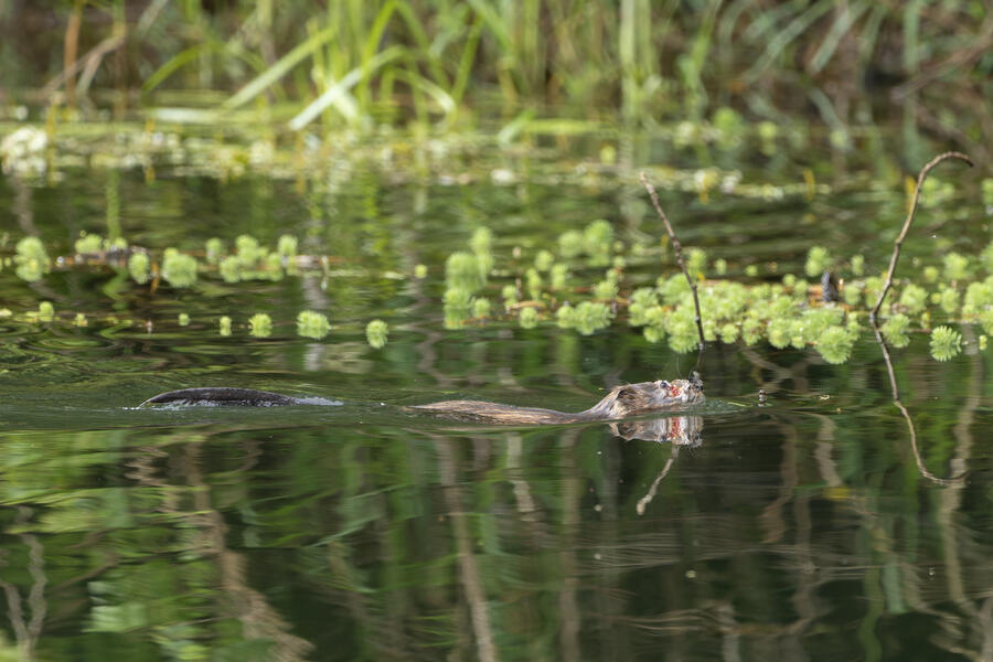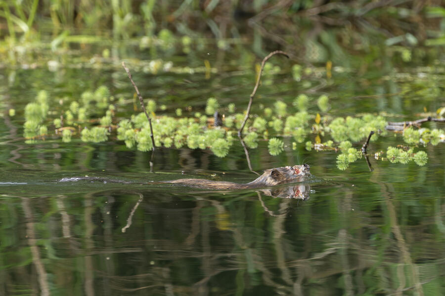 I saw a couple of large coypu/marmot creatures in some waterways... the first one didn't appear to have any eyes when I was looking through the tiny viewfinder in the camera. After loading the images onto my computer, I was amazed and a bit horrified to see that it appears to be the survivor of some horrible attack or injury. It appears to be missing much of its face, the poor thing! I watched it swim around and even clean its face and hands normally, so perhaps it's getting by just fine after its ordeal.