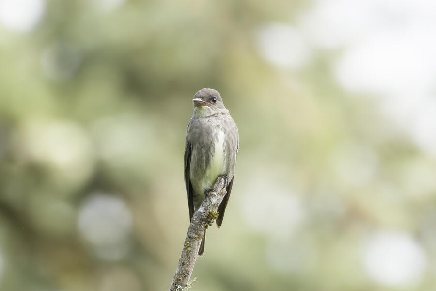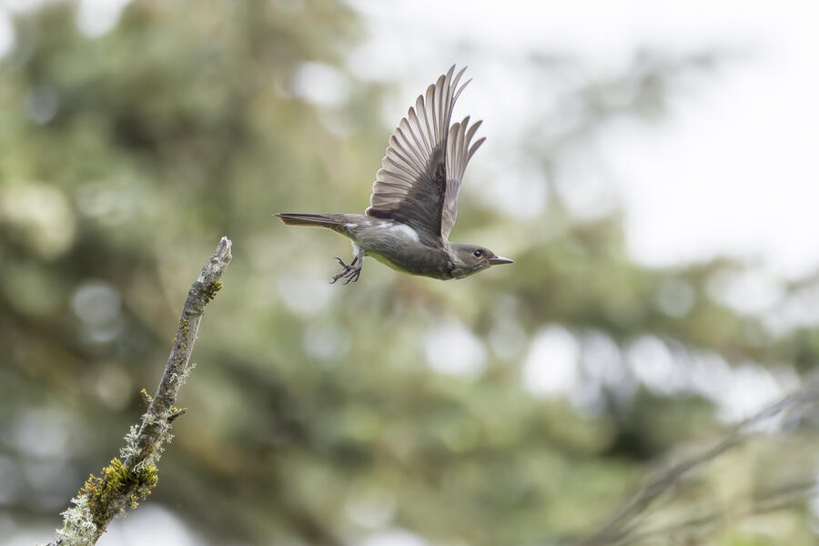 The next day, I went again to the downtown park popular with migrating birds. I heard a familiar flycatcher call in the distance: "quick, three beers!" I turned on the Merlin app and it confirmed that it was hearing an Olive-sided Flycatcher. Having never photographed one before, or so I thought, I hurried off to find it. I eventually did find it, but it was a bit high in some trees. Still, I'm happy with the photos I was able to get — a new photo lifer! I watched it for a while as it repeatedly perched and sallied off after insects. I was able to time one takeoff for my favorite photo of the morning.