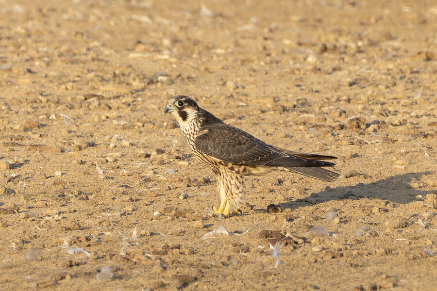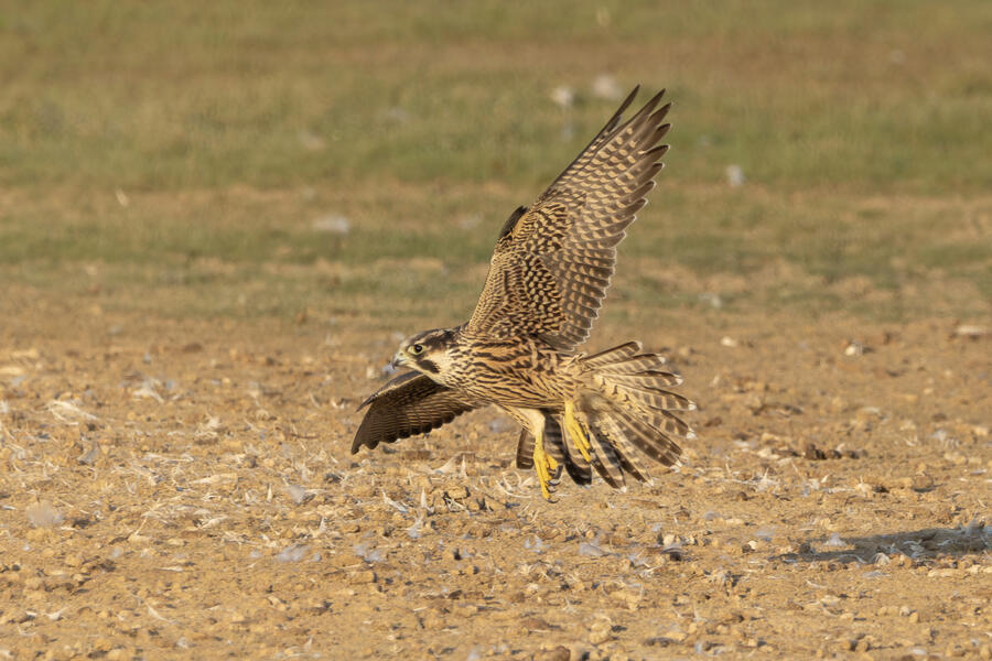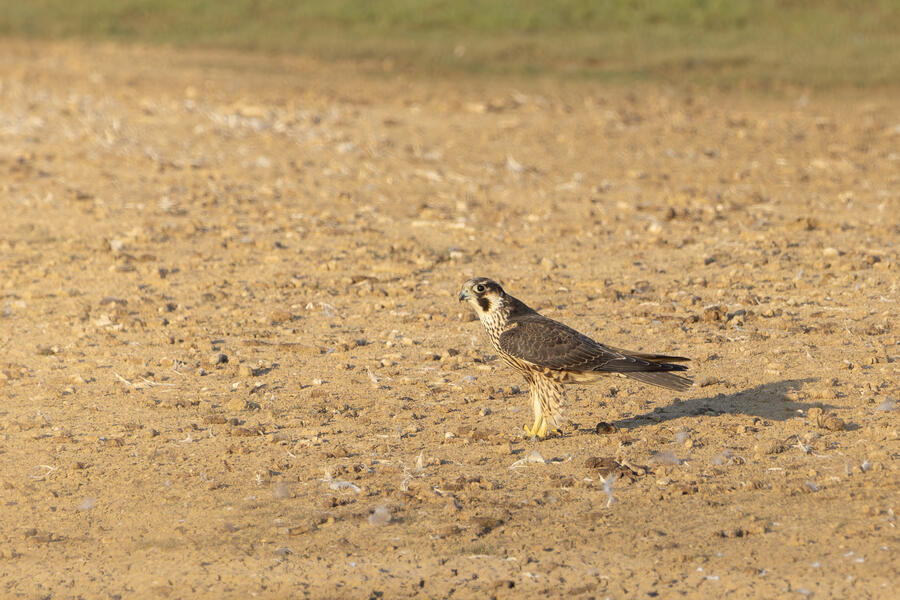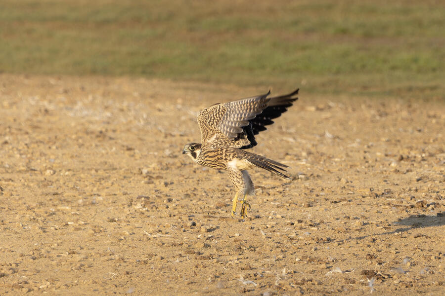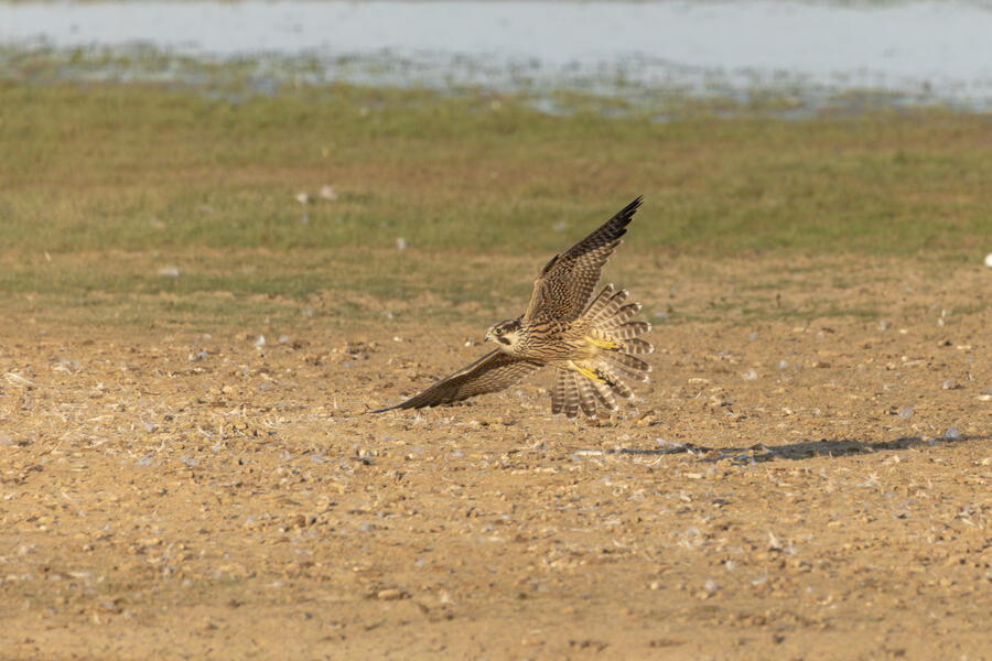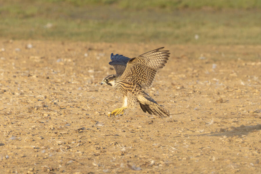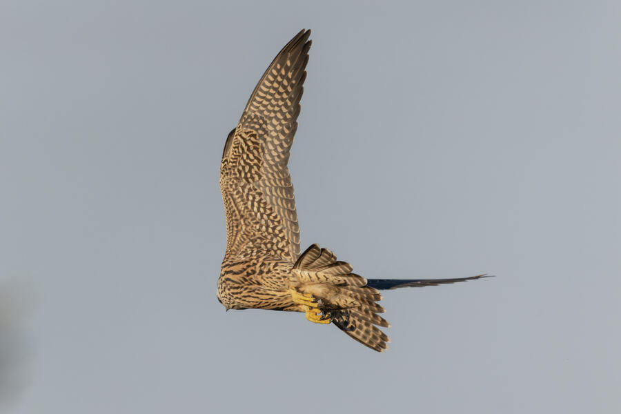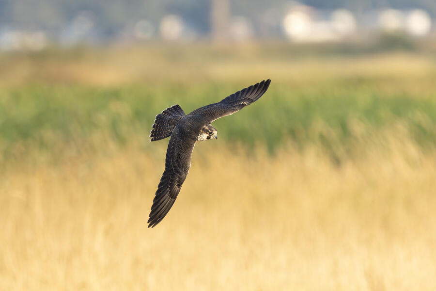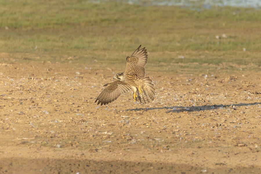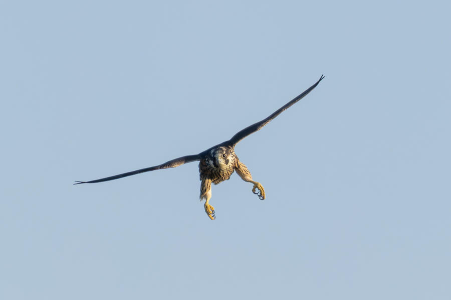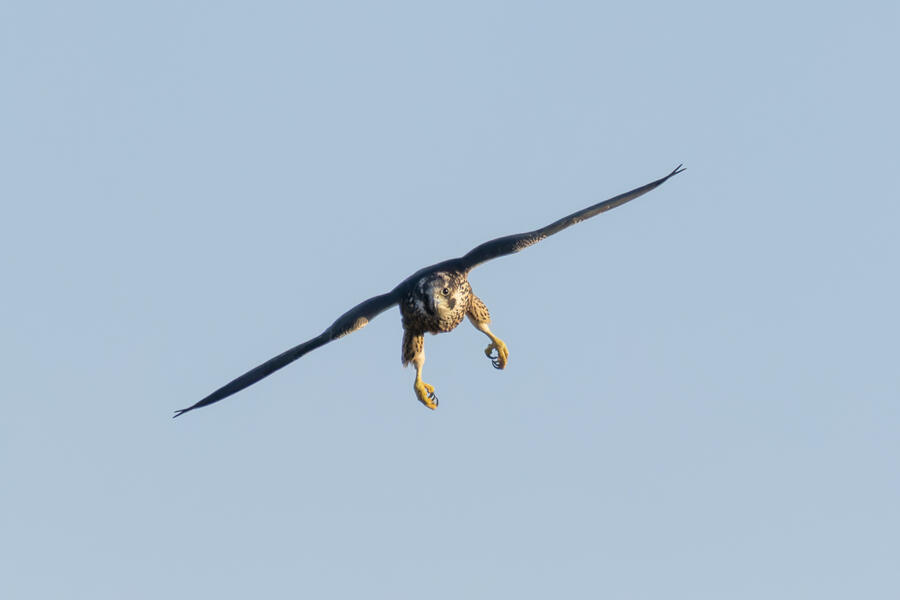 Peregrine Falcon (Juvenile)This young Peregrine was hunting the shorebirds gathered in the pond. The "landing gear" deployed here looks menacing but, at least while I was watching, it wasn't able to actually catch anything. I'm not sure how all the shorebirds avoid being caught! The Peregrine was moving extremely fast at times.