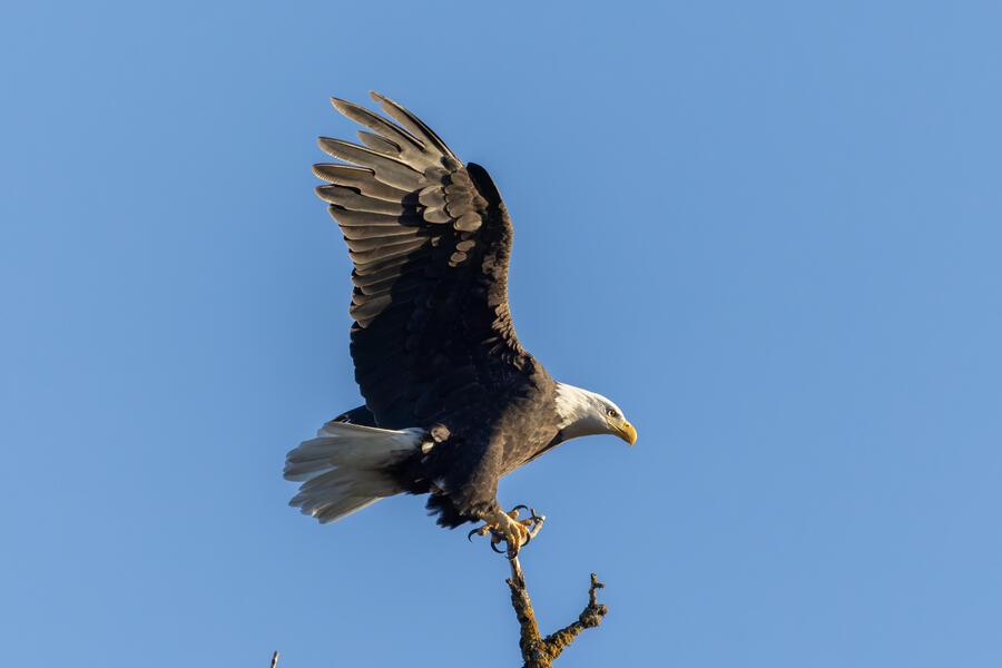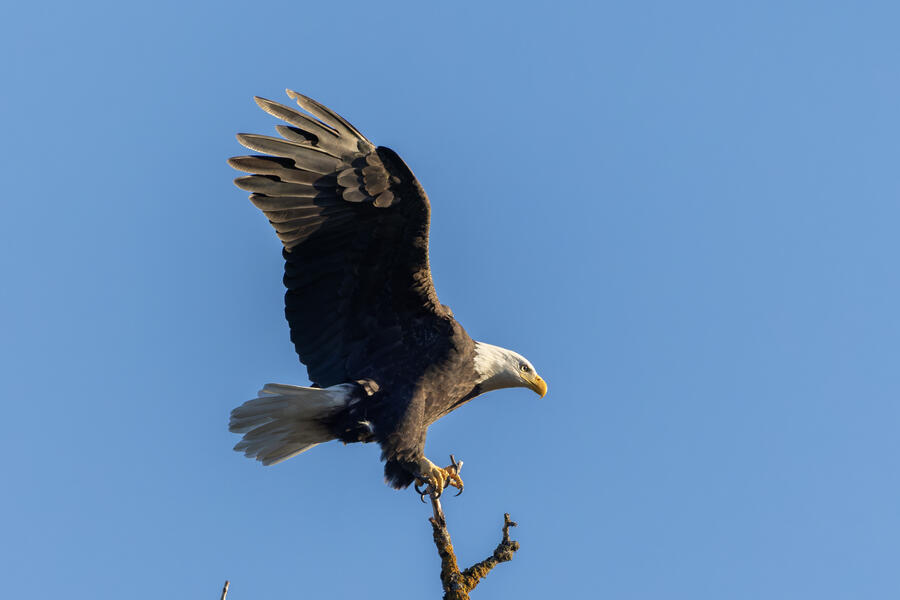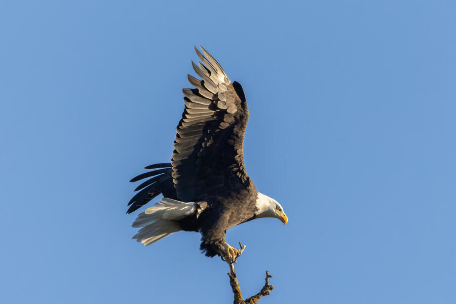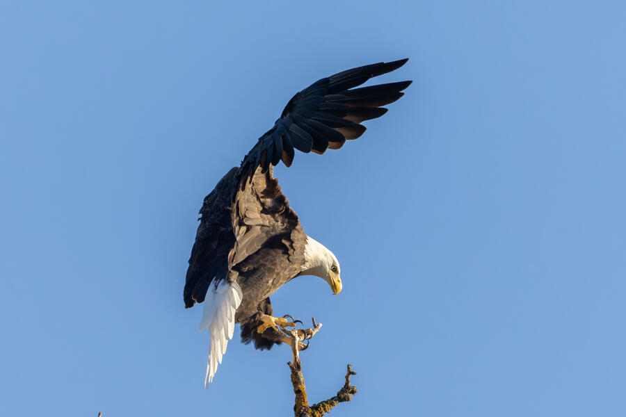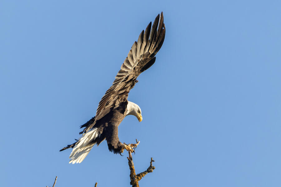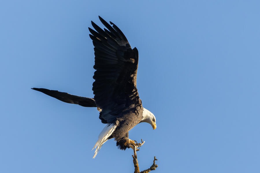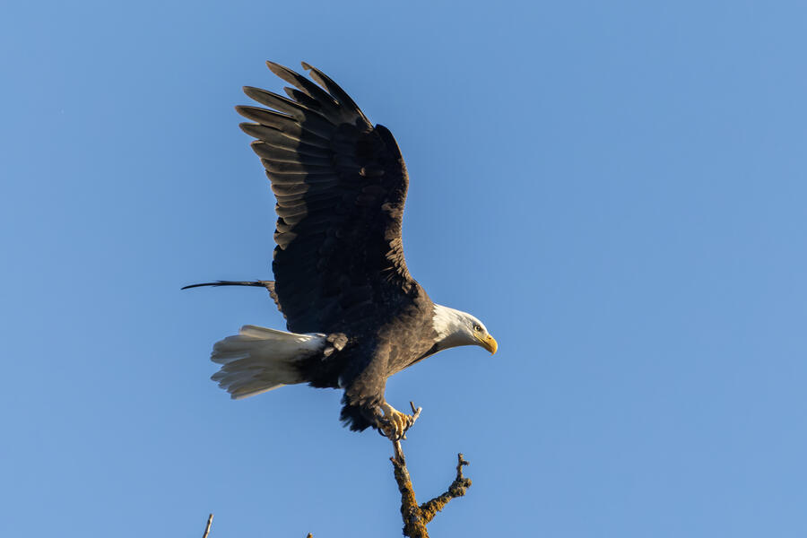 I got a cool sequence of shots of a Bald Eagle landing on perch, but it was a bit above my head, the light was harsh, and the background is plain blue sky. They are good photos but they're missing a few elements that would make them "great" in my opinion. But it's always nice to see these impressive birds!