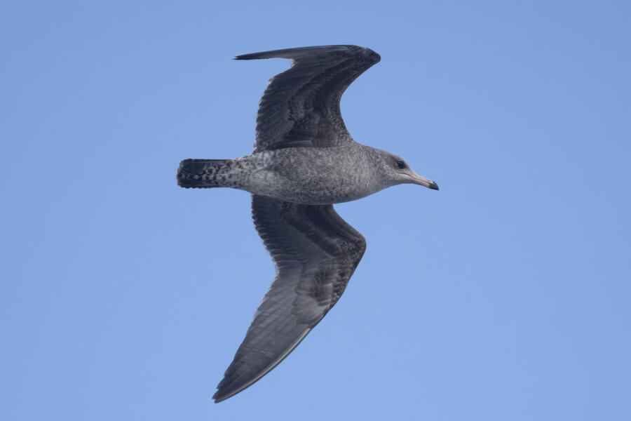 California Gull1st-cycle California Gull. Bill is long and straight, too long for Ring-billed, without enough of a bulge at the gonys for a Western/Glaucous-winged/Herring. Prominent gape. The pale tips of the tail feathers is visible. The eye is not beady enough (too large relative to head) for Western. Overall color is too dark for Ring-billed.