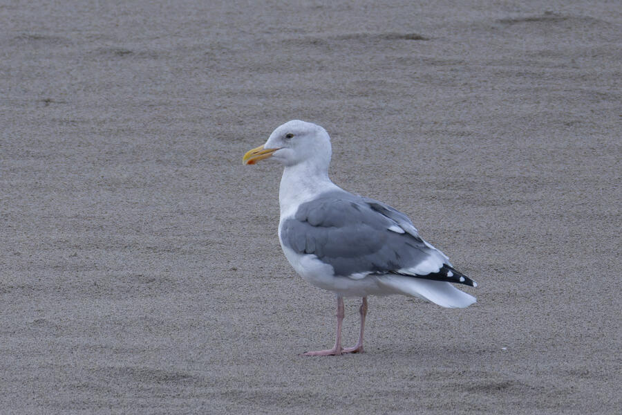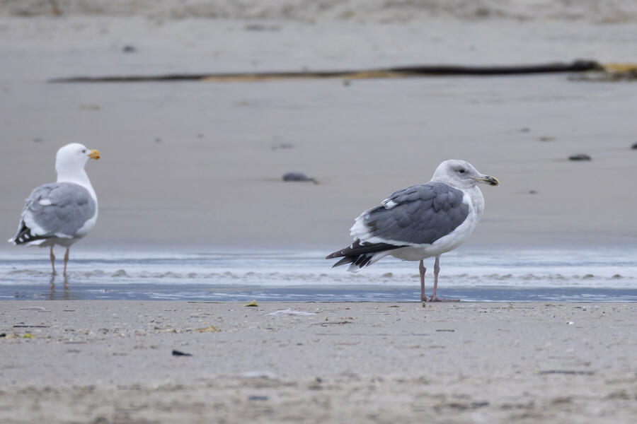 California GullThese are yellow-legged gulls, which on the Oregon coast means California, Ring-billed, or Short-billed. The bills are too large, and have red and black markings, which eliminate Short-billed. The red markings on the bills, prominent gapes, and dark lines behind the eyes mean these are California Gulls.