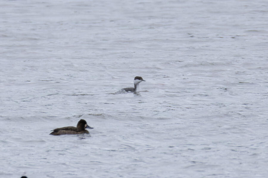 Horned Grebe, Lesser ScaupI thought there was a chance this was an Eared Grebe, since the bill looks a bit dark and small. The head shape doesn't look right though, so it's almost certainly a Horned Grebe.