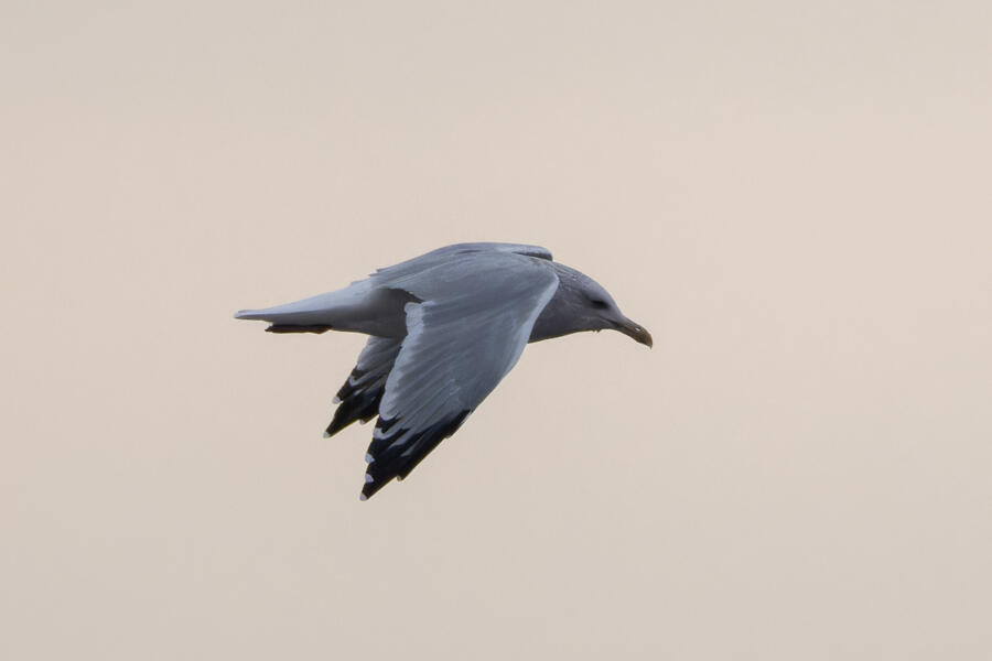 American Herring GullThe gray color on the head and bill size and shape rule out Western Gull for this one. I think the bill may work for both Thayer's and American Herring, but the underside of the far wing is black where Thayer's would be much lighter. This bird seems to be growing out its primaries, but for a Thayer's we'd still see some white-tipped long "tongues" on some of the full-length primaries. That leaves this as an American Herring Gull.