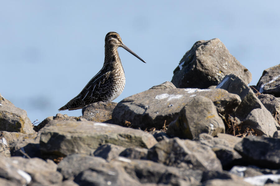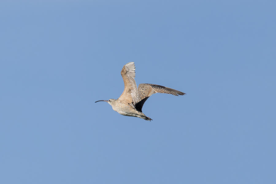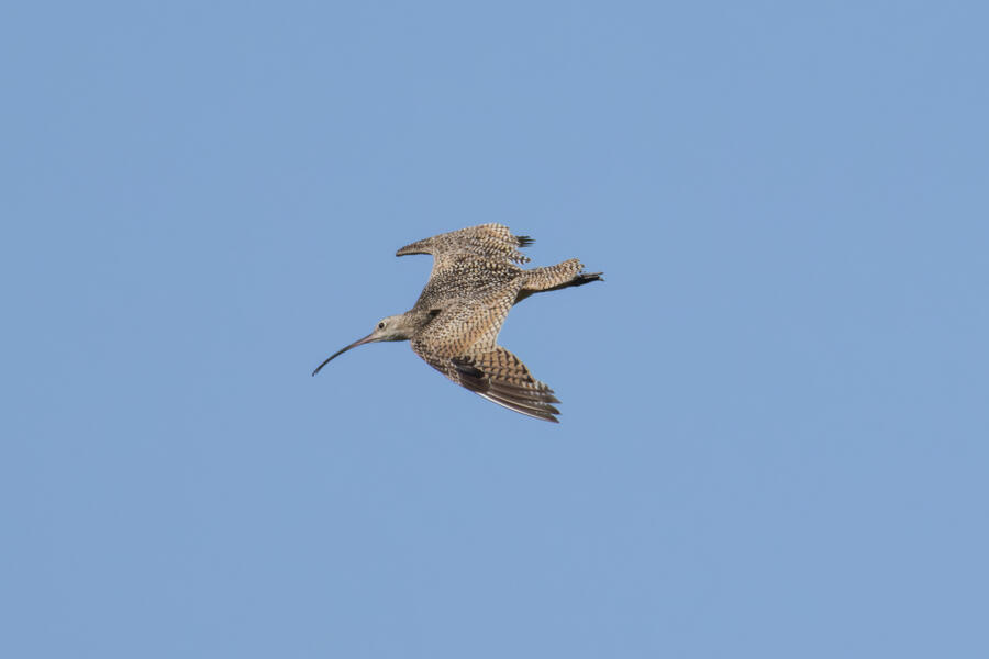 Shorebird season continues! I went out looking to see a rare Long-billed Curlew in the late afternoon. It had been reported all day by many people, so I thought my chances were pretty good. After a mile walk in the heat, I was somehow unable to see the large bird on the mudflats where I expected it to be foraging. As I was standing there entering something into my eBird checklist on my phone I heard loud cries of what sounded a bit like a gull. The calls took a few seconds to register in my brain, but then I had my camera up and began shooting photos of a pair of large birds flying off. Luckily, they briefly came back toward me before heading off for good. They must have been Curlews, but there were two of them! Nobody else had reported more than one all day. After double-checking my audio recording, and photos on the computer, it was definitely a pair of Long-billed Curlews. I would have loved to have watched them foraging on the ground for a while, but I guess it was fortuitous that I was present when they flew off (and that I was able to report two of them). The mudflats were surrounded by lots of areas with tall grass, so perhaps both were able to hang out somewhere out of sight for me, while one of them was able to avoid being spotted by everyone else.