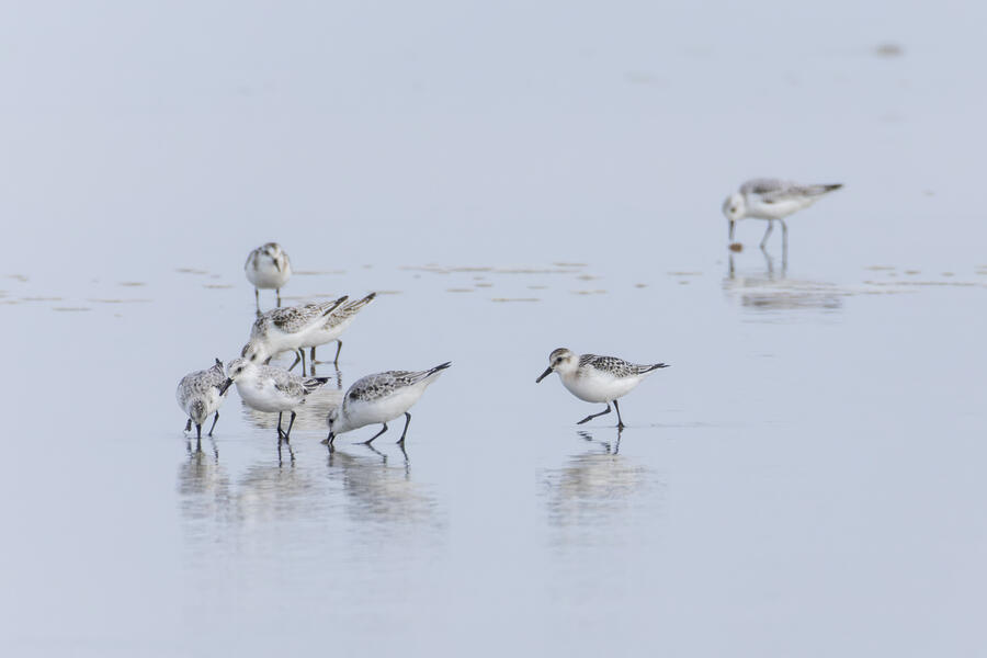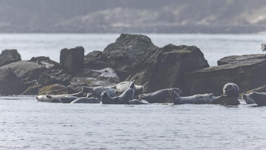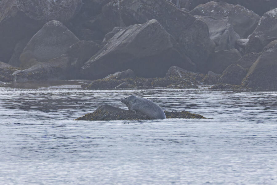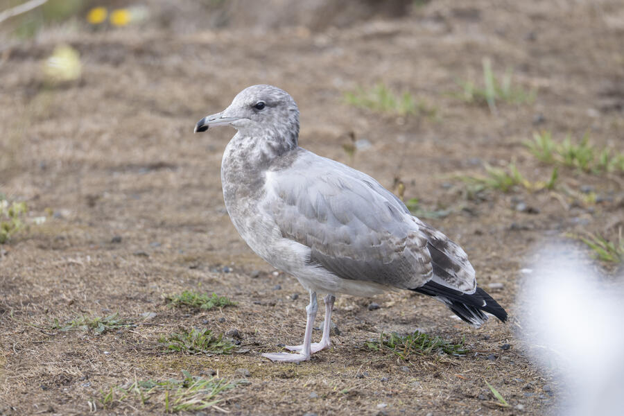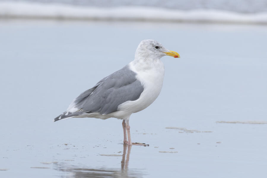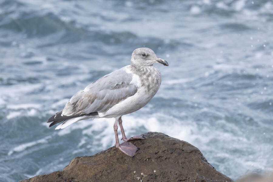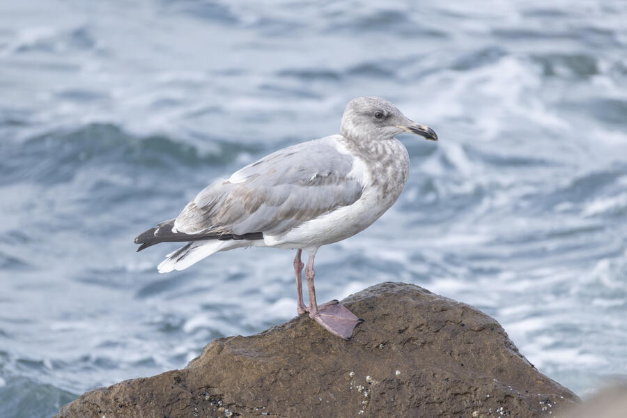 Western x Glaucous-winged Gull (hybrid)This looks mostly like a Glaucous-winged, but the back and wingtips are pretty dark. The bill is a bit too strongly orange/yellow, and the gonys is perhaps bulging too much. The orbital is an indistinct color, not pink enough for pure Glaucous-winged. The legs may be a bit too pale as well.