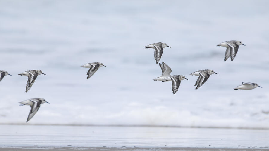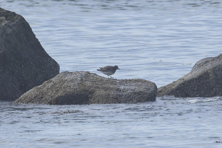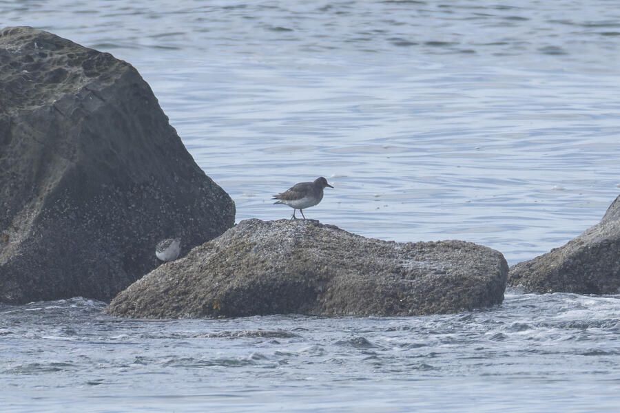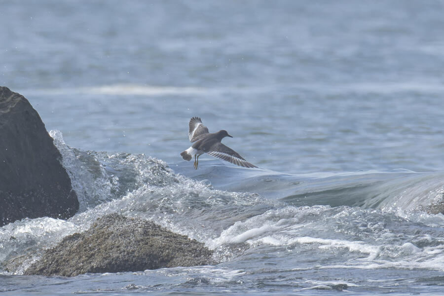 SurfbirdThis bird was a bit bigger than the nearby Black Turnstone, and had more yellowish legs and a thicker bill. The clinching field mark to distinguish this bird from the Black Turnstones is the rump in flight: a Black Turnstone would have a very prominent white patch on the lower back (rump) in flight, where this bird's rump (the part above the wide white tail stripe) is plain brown.