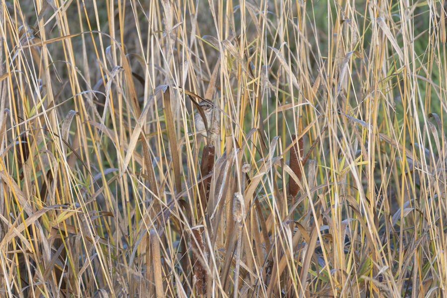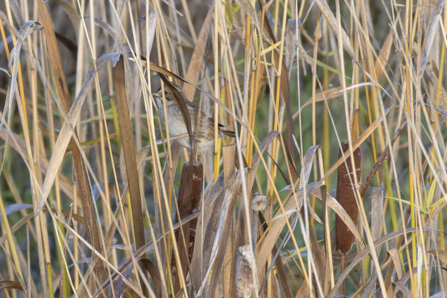 I also made a pair of visits out to see the Swamp Sparrow. After again locating this bird by ear, it briefly popped up among the cattails to fly a short distance. I got to photograph it while hearing a second one calling in response.