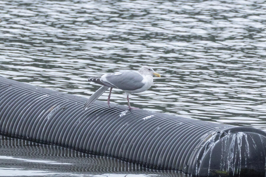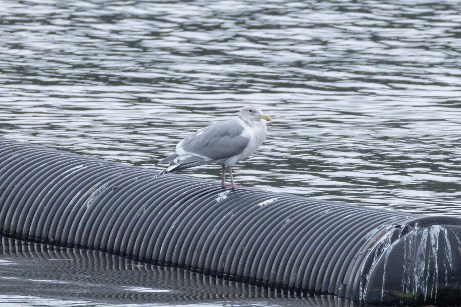 Western x Glaucous-winged Gull (hybrid)In person, the back and wingtips looked more pale gray. That lead me to believe this was an American Herring x Glaucous-Winged "Cook Inlet" gull, but the photos show a bit more color in the back and wingtips, and the bill is a bit too orange and bulbous. I've changed my mind and am calling this a Western x Glaucous-Winged "Olympic" gull.