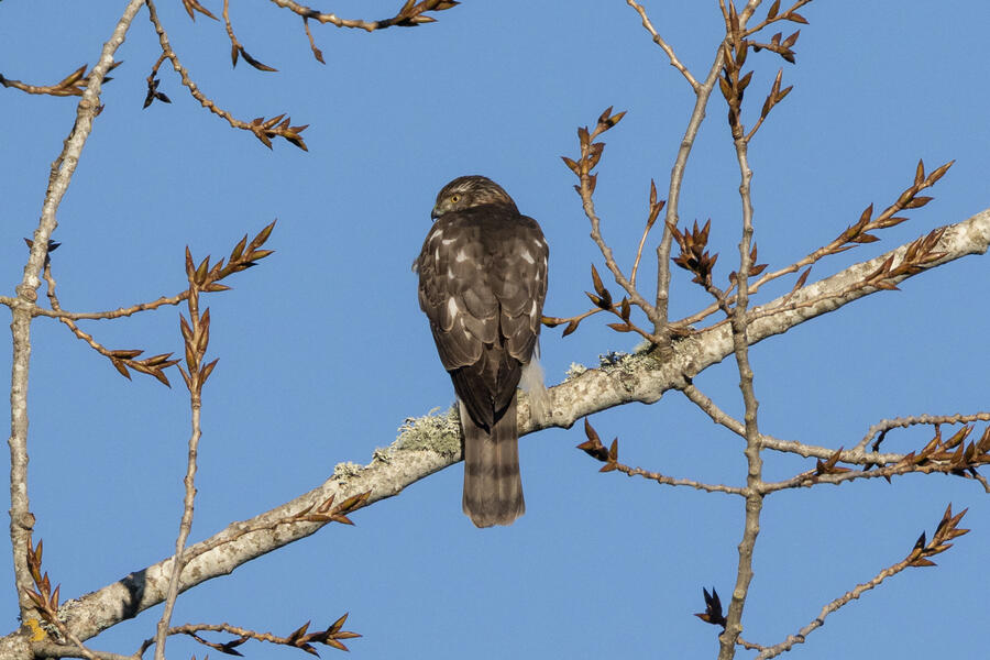 Sharp-shinned HawkThis hawk was super tiny (about the size of a Jay), so that's the main field "mark" I'm using to distinguish it from Cooper's Hawk. The tail also ends with a pale brown band, not a dark band or dark band with white edge. The legs are certainly skinny and the eye doesn't have the fierce brow appearance of a Cooper's.