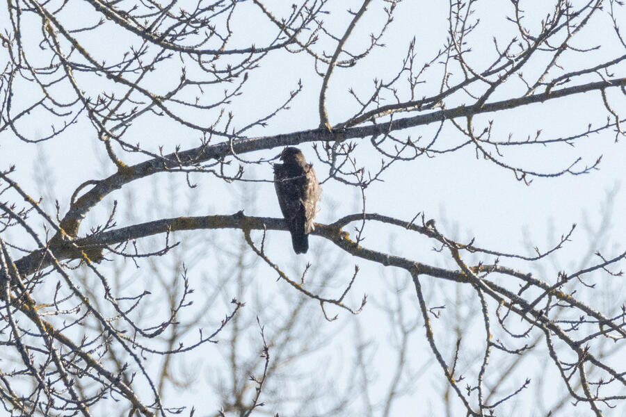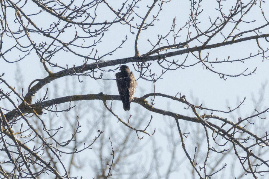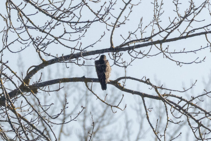 Red-tailed HawkThis hawk has many narrow bands across its tail, which looks to be a good field mark for immature Red-tailed.