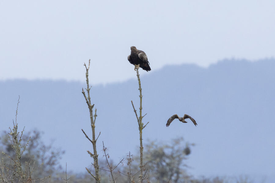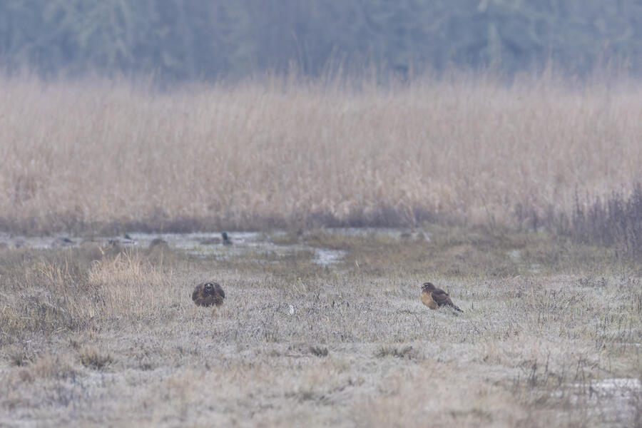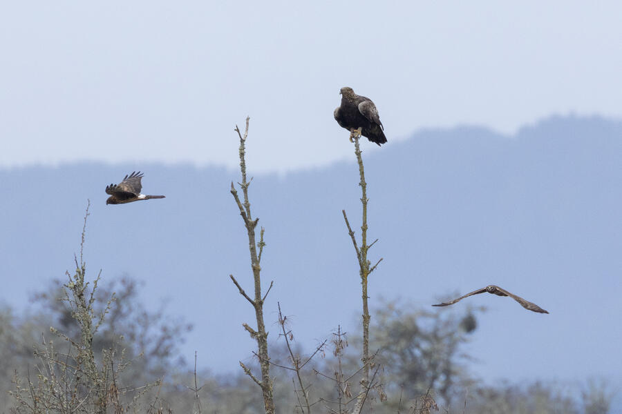 Red-tailed Hawk, Northern HarrierA Red-tailed Hawk eating something while a Northern Harrier watches and waits from a safe distance.