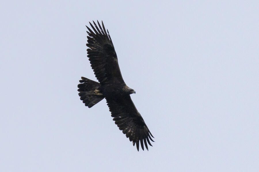 Golden EagleCompared to a soaring Bald Eagle, a Golden Eagle appears to be slightly smaller-headed and longer-tailed.